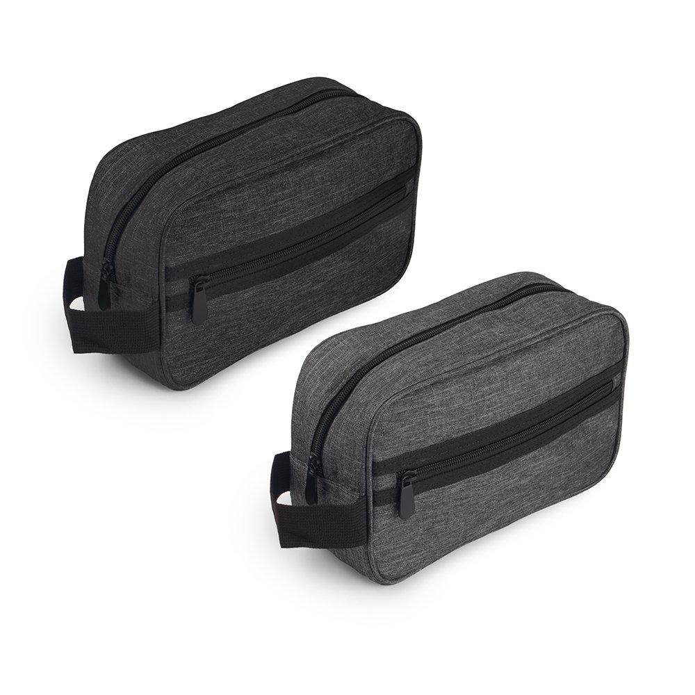 Nécessaire de tecido poliéster. Conta com alça de mão prática e bolso externo com zíper para maior organização e segurança. Ideal para viagens e uso diário.