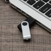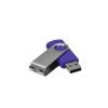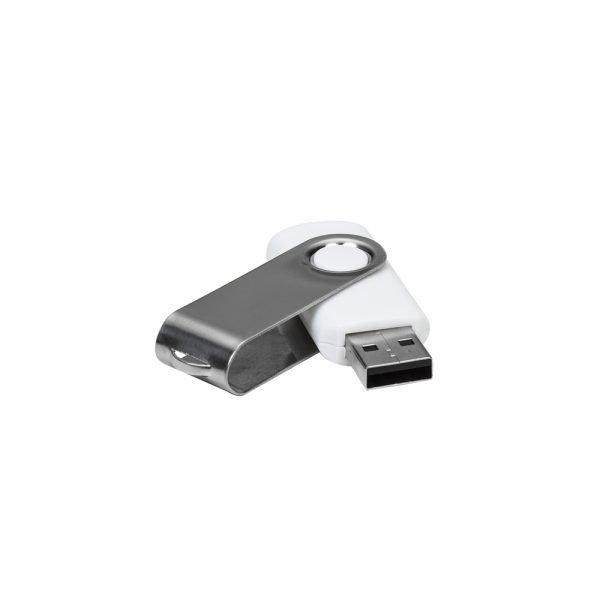 Pen drive giratório metálico, disponível para 4GB/8GB/16GB/32GB, parte interna preta em plástico. Possui “argola” na parte em metal feita para colocar algum cordão.