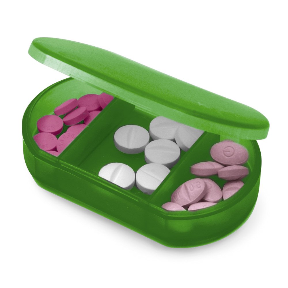 Porta comprimidos. Possui três divisórias internas, garantindo espaço suficiente para organizar sua medicação de forma eficiente e conveniente.
