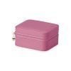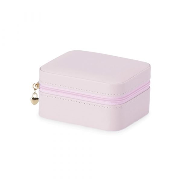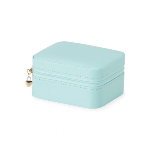 Porta joias de couro sintético com revestimento aveludado. Possui compartimentos internos para anéis, brincos, pulseiras e colares.