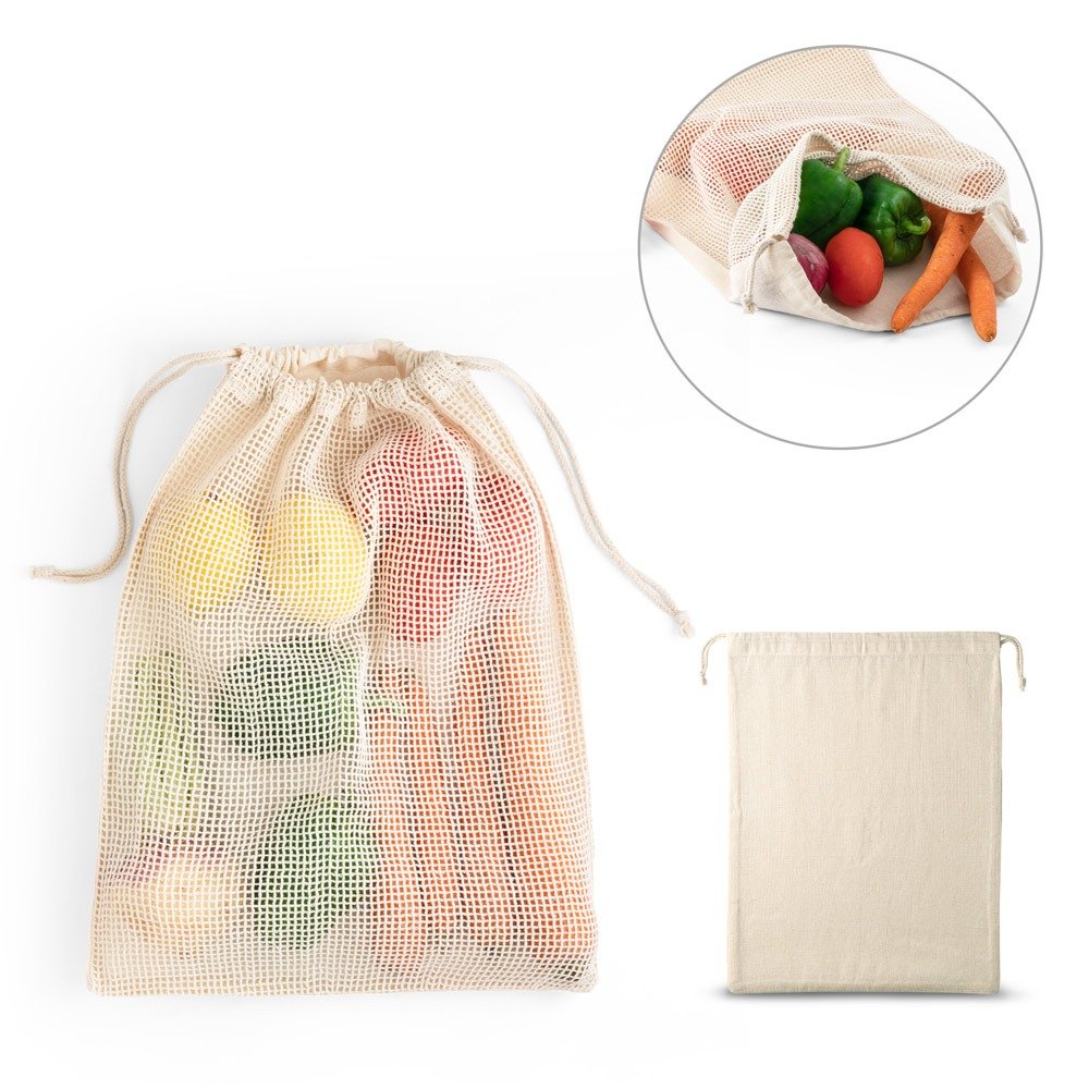 Sacola 100% algodão (120 g/m²) com malha 100% algodão na parte frontal (100 g/m²) e cordões em algodão para fechar. Sacola ideal para levar alimentos. 300 x 400 mm