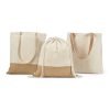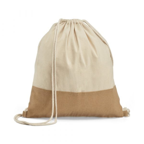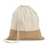Sacola tipo mochila 100% algodão (160 g/m²) com detalhe em imitação de juta e alça em algodão. Tamanho: 37 x 41 cm