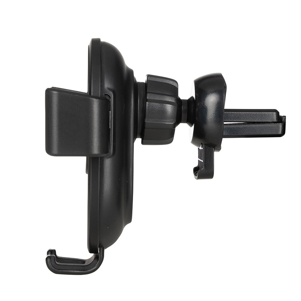 Suporte veicular com carregamento por indução. O produto contém hastes de ajuste automático. Acompanha presilha para encaixe na saída de ar do veículo e cabo USB 1m para ativação do modo indução. Tamanho: 8,7 x 9,8 cm