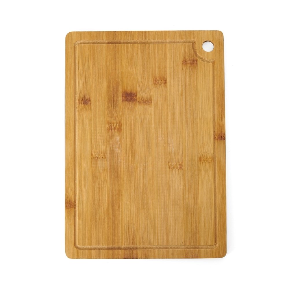 Tábua de corte com canaleta e acesso para gancho. Tamanho: 28 x 22 cm.