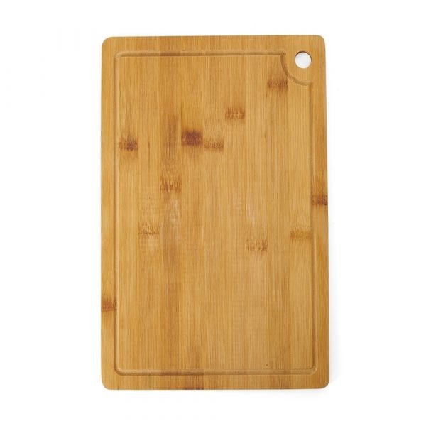 Tábua de corte com canaleta e acesso para gancho. Tamanho: 30 x 20 cm.